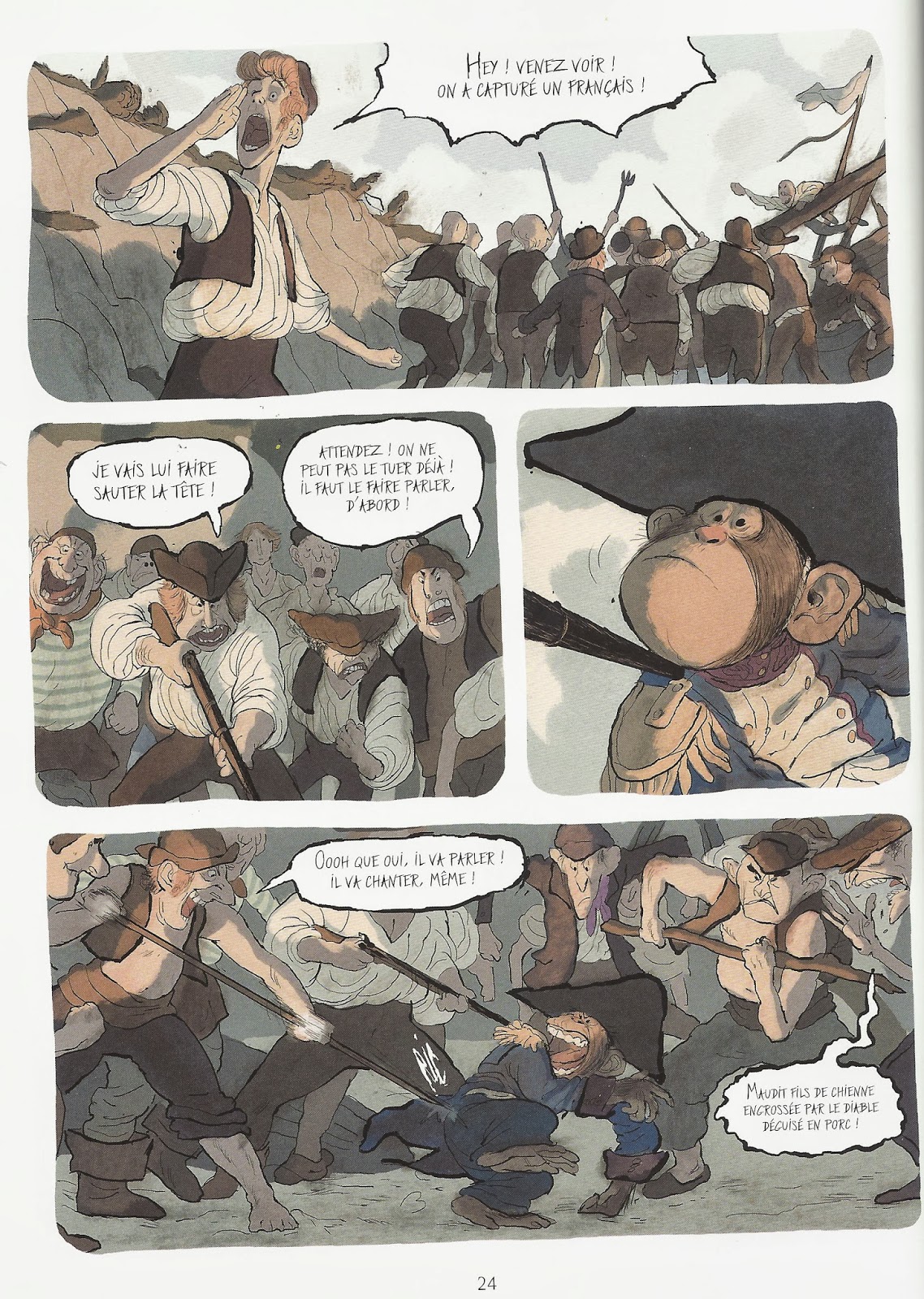 Cette parodie de la comédie humaine fait froid dans le dos : oui, la bêtise, l'ignorance et l'ignominie humaines sont sans limite. Les premières pages nous montre la l'arrogance et le sentiment de supériorité des français, via un capitaine qui fustigent les droits de l'homme qui l'empêche de travailler. Son job, c'était la traite des esclaves. Mais ce capitaine déteste par dessus tout les anglais et les rhabilles en quelques bulles.