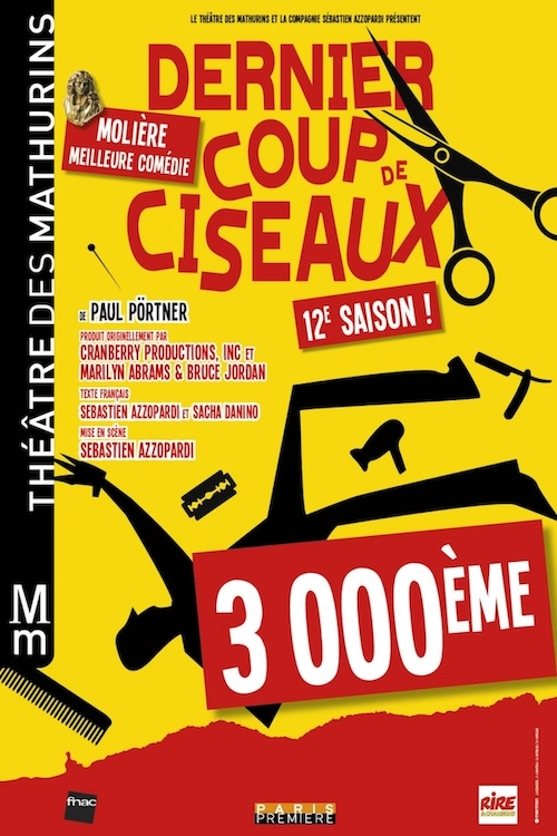 Le dernier coup de ciseaux se joue au Théâtre des Mathurins, dans le 8ème arrondissement. Cette pièce a reçu en 2014 le Molière de la meilleure pièce comique et atteint sa millième représentation ! Autant dire que c'est un énorme succès... bien mérité.